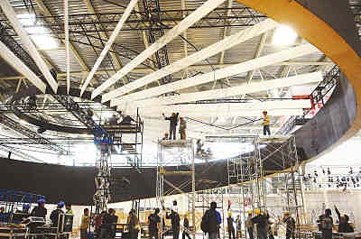 2008(第十屆)北京國際汽車展覽會將于4月22日在北京中國國際展覽中心舉行。本屆車展將有225家海外廠商和1800余家國內(nèi)廠商參展。圖為14日北京新國展中心,工作人員在一巨大汽車引擎下緊張搭臺布展。