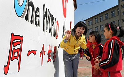 沈陽(yáng):小學(xué)校繪百米“奧運(yùn)墻”