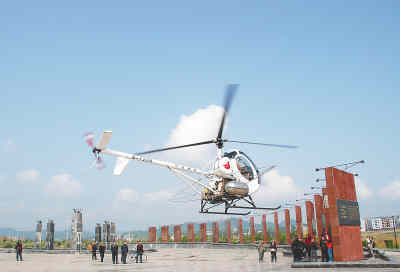 圖為4月15日上午,一架直升機起飛,趕赴火峰鄉(xiāng)的山林,為遭受蜀柏毒蛾“侵犯”的柏木林噴灑藥物。