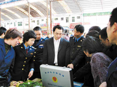 編碼管理系統(tǒng)的應用讓工商監(jiān)管得心應手,圖為郴州市工商局局長歐陽志剛(左四)檢查集貿市場。 | 工商管理工作需要有一定的經濟信息作保障,如今只要你打開郴州市工商系統(tǒng)的任何一臺電腦,全系統(tǒng)11個縣市區(qū)82個工商所的管轄范圍、市場監(jiān)管、兩費征繳等情況一目了然,這是郴州市工商局從2005年開始提升市場監(jiān)管水平、加強市場監(jiān)管效能上實行編碼管理取得的有益嘗試。 “在基層工商所過去是90%在收費,只有‘收費能手’,沒有辦案骨干;如今則是90%搞監(jiān)管,主要職能加強監(jiān)管,工商管理水平得到了極大提高”。郴州市工商局局長歐陽志剛對改革創(chuàng)新的編碼管理系統(tǒng)頗有一番感慨。