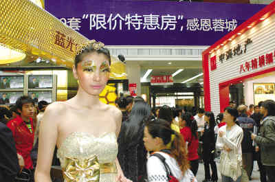 眼下,房地產(chǎn)市場受宏觀調(diào)控政策影響人氣低迷,開發(fā)商為促銷樓盤,不得不使出各種吸引眼球的“高招”。圖為在成都春季房地產(chǎn)交易會(huì)上,某樓盤聘請(qǐng)的職業(yè)模特。