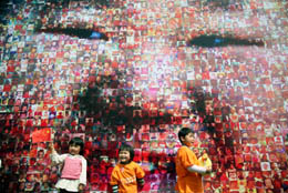 4月26日,三名小朋友在親子節(jié)活動(dòng)現(xiàn)場由2008張照片組成的“奧運(yùn)寶寶笑臉”前留影。當(dāng)日,一場主題為“娃娃迎奧運(yùn)、親子圓夢想”的親子節(jié)活動(dòng)在南京市玄武湖舉行,吸引眾多小朋友和家長參與。