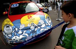 日前,長沙市某商場門口展出了幾輛以迎奧運(yùn)為主題的彩繪汽車。車身上繪滿各種圖案的彩繪汽車展示奧運(yùn)和中國文化,吸引了不少市民參觀。圖為一名小孩在參觀彩繪汽車。