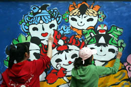 作為北京市民參與奧運(yùn)環(huán)境建設(shè)的重要標(biāo)志,北京第一面奧運(yùn)文化墻日前在北京理工大學(xué)西校墻亮相,400多名熱心市民和奧運(yùn)志愿者在約600米長的墻上創(chuàng)作,由此拉開了北京市民迎奧運(yùn)文化墻創(chuàng)意設(shè)計(jì)活動(dòng)的帷幕。圖為大學(xué)生在奧運(yùn)文化墻上進(jìn)行創(chuàng)作。
