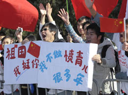 4月24日,華人華僑為奧運(yùn)圣火傳遞活動(dòng)加油。當(dāng)日,北京奧運(yùn)圣火傳遞活動(dòng)在澳大利亞堪培拉舉行!
