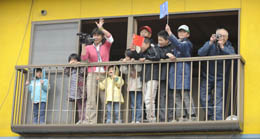 4月26日,日本民眾在陽臺(tái)上觀看火炬?zhèn)鬟f。當(dāng)日,北京奧運(yùn)會(huì)圣火傳遞活動(dòng)在日本長野舉行。