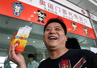 | 5月5日,阜陽市民在中國銀行阜陽支行奧運門票代售點展示自己購買的奧運門票。新華社發(fā)(戴文學