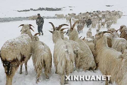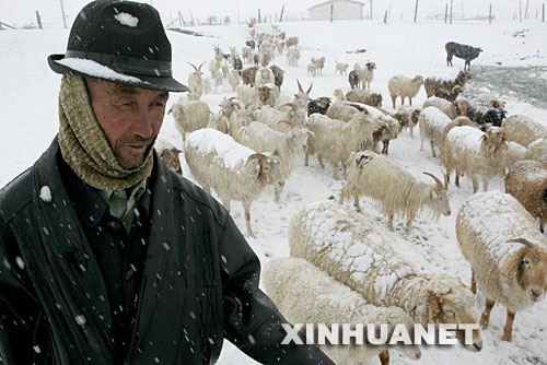 圖為5月7日,新疆哈密牧民在雪中牧羊。