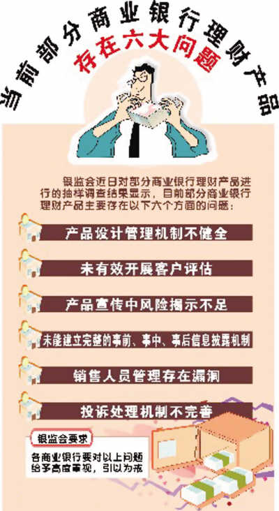 銀監(jiān)會(huì)對(duì)部分銀行理財(cái)產(chǎn)品進(jìn)行了抽樣調(diào)查,發(fā)現(xiàn)部分銀行在開(kāi)展理財(cái)業(yè)務(wù)的過(guò)程中存在較為嚴(yán)重的違規(guī)行為;核心是未嚴(yán)格且有效執(zhí)行相關(guān)法律法規(guī)和監(jiān)管規(guī)章!安糠稚虡I(yè)銀行未能按照符合客戶(hù)利益和風(fēng)險(xiǎn)承受能力的適應(yīng)性原則設(shè)計(jì)理財(cái)產(chǎn)品,沒(méi)有從資產(chǎn)配置的角度進(jìn)行產(chǎn)品開(kāi)發(fā)和投資組合設(shè)計(jì),沒(méi)有應(yīng)用科學(xué)合理的測(cè)算方法預(yù)測(cè)理財(cái)投資組合的收益率,沒(méi)有設(shè)置相應(yīng)的市場(chǎng)風(fēng)險(xiǎn)監(jiān)測(cè)指標(biāo)和有效的市場(chǎng)風(fēng)險(xiǎn)識(shí)別、計(jì)量、監(jiān)測(cè)和控制體系! “產(chǎn)品設(shè)計(jì)管理機(jī)制不健全”是部分銀行個(gè)人理財(cái)產(chǎn)品的“第一宗罪”。同時(shí),部分商業(yè)銀行在代理銷(xiāo)售其他金融機(jī)構(gòu)投資產(chǎn)品過(guò)程中,沒(méi)有對(duì)所代理產(chǎn)品進(jìn)行充分分析,對(duì)產(chǎn)品提供者經(jīng)營(yíng)管理、市場(chǎng)投資和風(fēng)險(xiǎn)管理能力沒(méi)有進(jìn)行有效評(píng)估,沒(méi)有明確界定雙方權(quán)利義務(wù)和風(fēng)險(xiǎn)責(zé)任,對(duì)代理銷(xiāo)售產(chǎn)品的風(fēng)險(xiǎn)收益監(jiān)測(cè)數(shù)據(jù)沒(méi)有進(jìn)行必要驗(yàn)證。 其后是“未有效開(kāi)展客戶(hù)評(píng)估”。部分商業(yè)銀行沒(méi)有進(jìn)行客戶(hù)風(fēng)險(xiǎn)偏好評(píng)估工作,或評(píng)估工作流于形式;沒(méi)做到準(zhǔn)確了解客戶(hù)的財(cái)務(wù)狀況、投資目的、投資經(jīng)驗(yàn)以及風(fēng)險(xiǎn)認(rèn)知和承受能力;沒(méi)有評(píng)估客戶(hù)是否適合購(gòu)買(mǎi)所推介的理財(cái)產(chǎn)品,并將有關(guān)評(píng)估意見(jiàn)告知客戶(hù)。 同時(shí)“產(chǎn)品宣傳中風(fēng)險(xiǎn)揭示不足”。部分商業(yè)銀行“未能建立完整的事前、事中、事后信息披露機(jī)制”;未及時(shí)通過(guò)有效渠道和方式向客戶(hù)告知相關(guān)情況,特別是在理財(cái)產(chǎn)品存續(xù)期內(nèi),未能很好地向客戶(hù)提供方便、及時(shí)、準(zhǔn)確的資產(chǎn)變動(dòng)、期末資產(chǎn)估值等重要信息。 此外,部分商業(yè)銀行對(duì)理財(cái)產(chǎn)品銷(xiāo)售人員的管理存在漏洞;而且投訴處理機(jī)制不完善。主要表現(xiàn)為部分商業(yè)銀行沒(méi)有對(duì)本行理財(cái)產(chǎn)品銷(xiāo)售人員進(jìn)行有效管理,沒(méi)有建立相應(yīng)的個(gè)人理財(cái)業(yè)務(wù)人員資格考核與認(rèn)定、繼續(xù)培訓(xùn)、跟蹤評(píng)價(jià)等管理制度。缺乏專(zhuān)門(mén)的人員和部門(mén)及時(shí)處理客戶(hù)投訴,客戶(hù)投訴情況分析研究不足,對(duì)于客戶(hù)投訴較多的理財(cái)業(yè)務(wù)環(huán)節(jié)和理財(cái)產(chǎn)品不能及時(shí)有效地解決和改正。