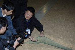 記者隨機(jī)來到32號倉前,這幢倉庫看起來約有兩層樓高,密封嚴(yán)實,順著倉庫外的狹窄鐵樓梯,記者攀到窗戶大小的進(jìn)倉口,貓著腰進(jìn)到糧倉,放眼望去,整個倉庫約有半個足球場大,腳下鋪滿一塵不染的塑料布,倉庫的頂梁就在面前。在倉庫入口的墻上掛著倉庫管理卡和糧情日志等記錄本,從記錄上得知,這個倉庫存放的是2005年收購進(jìn)來的二等小麥,存量為3571噸。在倉庫保管員的指導(dǎo)下,記者掀開了腳下的塑料布、薄膜、隔熱墊、纖維板四層材料后,方才見到庫存小麥。小麥麥粒飽滿,呈褐黃色,抓起一把在手中微有些涼意。
