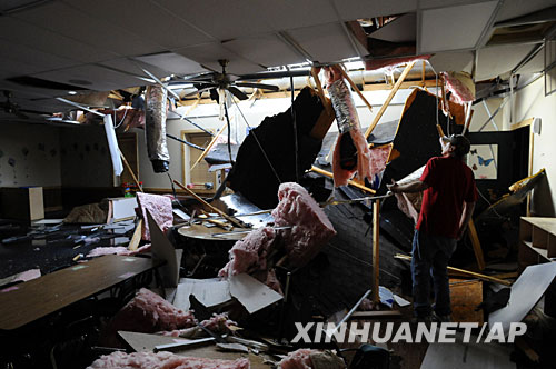 5月10日,在美國(guó)阿肯色州本頓維爾,一名男子查看一所學(xué)校受損的屋頂。新華社/美聯(lián) | |