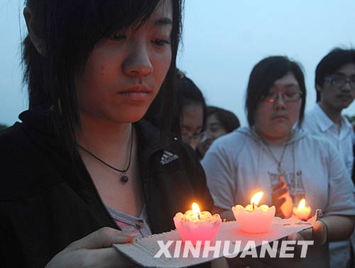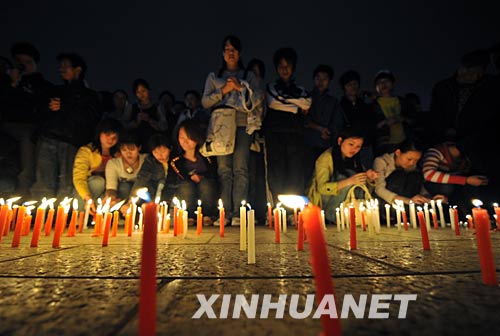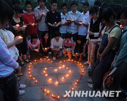 當(dāng)日,一些浙江工業(yè)大學(xué)學(xué)生在校內(nèi)舉行燭光祈;顒(dòng),用這種方式表達(dá)對(duì)地震災(zāi)區(qū)人民的牽掛,希望災(zāi)區(qū)人民早日渡過(guò)難關(guān)。 新華社記者 徐昱 攝 |