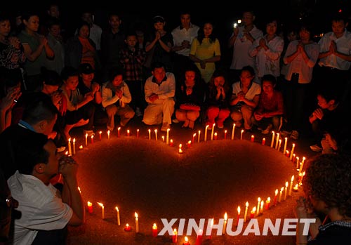 5月14日,學(xué)生們手持蠟燭為四川地震災(zāi)區(qū)祈禱。