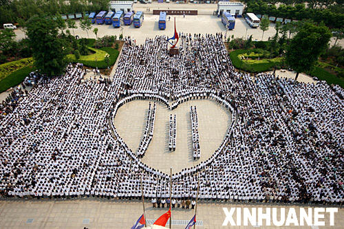 全院師生圍成一個(gè)大大的“心”形,中間是一個(gè)“川”字,師生們通過這樣的方式向?yàn)?zāi)區(qū)的人民表達(dá)一種信念,不管是“四川”“汶川”“北川”,還是凝結(jié)在人們眉間的“川”字,全國人民都永遠(yuǎn)心系災(zāi)區(qū)。