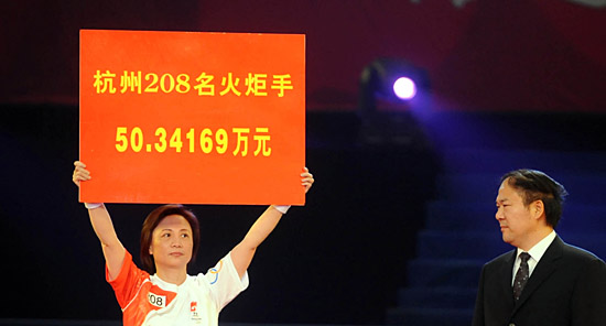 | 在杭州黃龍?bào)w育館,吳小璇代表杭州所有火炬手為災(zāi)區(qū)捐款,她也成為圣火暫停傳遞前的最后一棒火炬手。新華社記者 徐昱