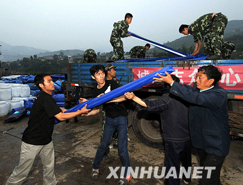 當(dāng)日,首批聯(lián)合國(guó)捐贈(zèng)的320頂帳篷運(yùn)抵四川汶川水磨鎮(zhèn)。
