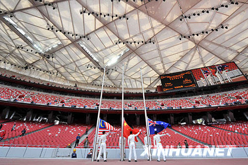 圖為旗手們在“鳥巢”內(nèi)進(jìn)行升旗演練(5月18日攝)。 | |