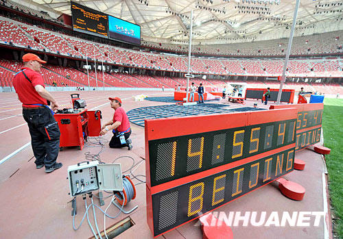| 圖為技術(shù)人員在“鳥巢”內(nèi)調(diào)試設(shè)備(5月18日攝)。 |