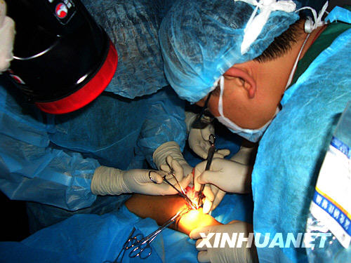 5月22日,天津抗震醫(yī)療隊(duì)骨科專家在手電筒下進(jìn)行手術(shù)。