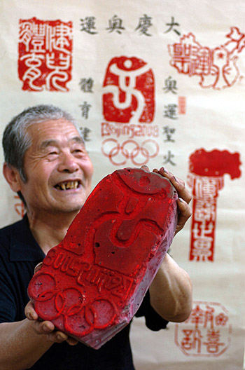 山東省淄博市臨淄區(qū)梧臺鎮(zhèn)王青村的七旬老人王天德歷時一年半,用八塊青磚刻制的大型組合“奧運(yùn)情”刻章于近日完成。老人精心打磨的這八塊印章中包括“奧運(yùn)圣火傳遞世界報喜訊、體育健兒志在全球創(chuàng)輝煌”等內(nèi)容。 這是王天德老人在展示用青磚刻制好的“中國印”。