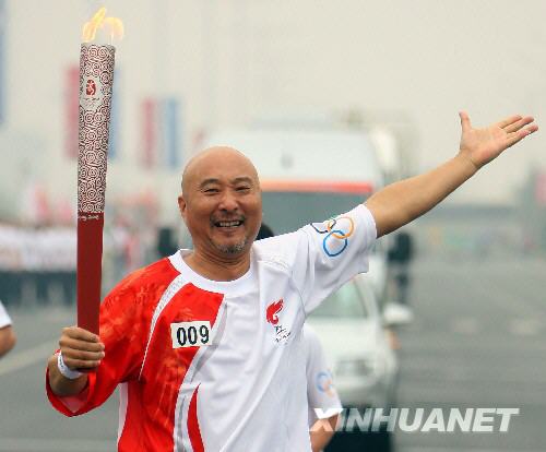 5月27日,火炬手陳佩斯在進(jìn)行傳遞。當(dāng)日,北京奧運(yùn)會(huì)圣火在江蘇南京傳遞。