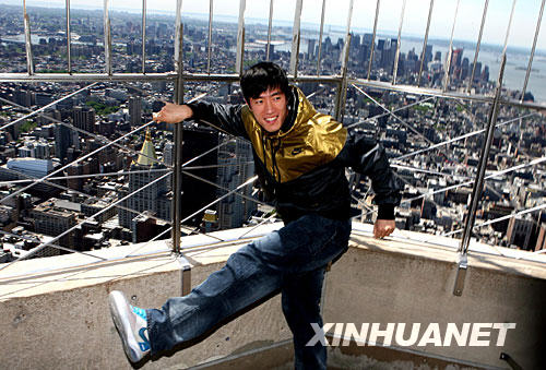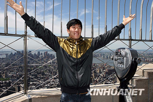 5月28日,在美國紐約帝國大廈86層觀景平臺,劉翔擺出跨欄姿勢供媒體拍攝。當日,劉翔在紐約出席田徑大獎賽記者見面會。第四屆銳步田徑大獎賽將于5月31日在紐約舉行。