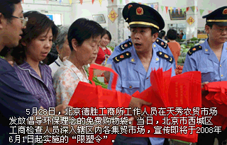 | 為配合6月1日將實(shí)行的“限塑令”,西安市各大賣場將對拎布袋子、菜籃子的消費(fèi)者實(shí)行多種形式的優(yōu)惠,來鼓勵大家減少使用塑料袋、減少白色污染。