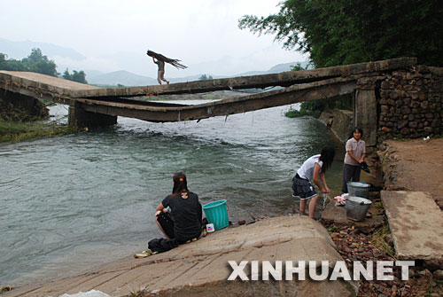 6月2日,在仙回瑤族鄉(xiāng)大中村,一名村民扛著木材從一座被洪水沖毀的橋上走過。 |