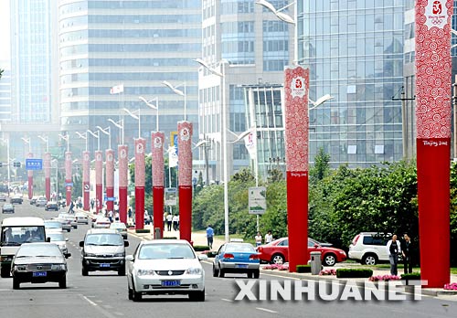 6月2日,青島市東海路沿線豎立起的“火炬”景觀裝飾。