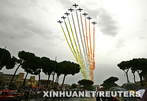 6月2日,在意大利首都羅馬的圓形大劇場(chǎng)上空,意大利空軍表演特技飛行。當(dāng)日是意大利國(guó)慶日,意大利舉行盛大閱兵儀式慶祝國(guó)慶。 新華社/路透