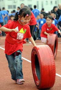 6月1日,孩子們在賽場上滾輪胎。當(dāng)日,南京市實驗幼兒園及其三所分園在南京五臺山體育場舉行“迎奧運,慶六一”親子運動會,近1500名小朋友和他們的家長走上賽場,參加15項趣味體育項目的比賽和健身操展演,表達對北京奧運會的期盼。