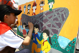 一名小學(xué)生在阜陽市清河廣場參加壁畫比賽。安徽阜陽市迎奧運暨抗震救災(zāi)少年兒童壁畫大賽日前在清河廣場舉行。