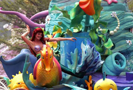 “美人魚(yú)”在香港迪斯尼樂(lè)園的大巡游上表演。本報(bào)記者:薛永興