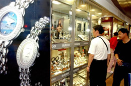 琳瑯滿目的香港鐘表店吸引游客駐足觀看。