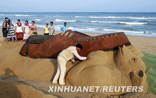 這座沙雕以一只皮鞋踩在北極熊身上為造型,寓意皮革工業(yè)會(huì)破壞環(huán)境。帕特奈克是為迎接6月5日世界環(huán)境日而進(jìn)行此項(xiàng)創(chuàng)作的。 新華社/路透