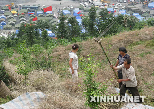 6月4日,汶川映秀鎮(zhèn)群眾在搶收油菜籽。 目前,四川汶川受災(zāi)群眾積極應(yīng)對(duì)災(zāi)情,努力開展生產(chǎn)自救,逐漸恢復(fù)農(nóng)業(yè)生產(chǎn),爭(zhēng)取將地震造成的損失減小到最低程度。