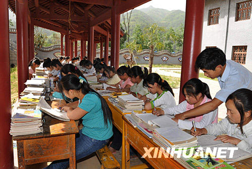 6月3日,陜西漢中青木川鎮(zhèn)輔仁中學英語老師在校園走廊里輔導學生。