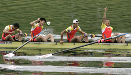 6月1日,中國隊(duì)選手黃鐘鳴、吳崇魁、張林、田軍(從左至右)在賽艇世界杯瑞士盧塞恩站男子輕量級(jí)四人單槳決賽中奪得冠軍。新華社/路透 | 5金1銀3銅,這是中國賽艇隊(duì)在2008年第二站世界杯瑞士盧塞恩站的成績。 盡管包括國際賽艇聯(lián)合會(huì)官方網(wǎng)站在內(nèi)的外國媒體開始用“powerhouse”(強(qiáng)手、霸主)來形容中國隊(duì),但中國隊(duì)領(lǐng)隊(duì)曹景偉分析說:5枚世界杯金牌說明不了什么。