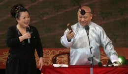 郭德剛在天津電視臺(tái)舉辦的“笑傲江湖”錄制中與影視明星表演傳統(tǒng)相聲。新華社發(fā) |