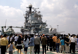 眾多游客在“基輔”號(hào)航空母艦上參觀。本報(bào)記者:何俊昌