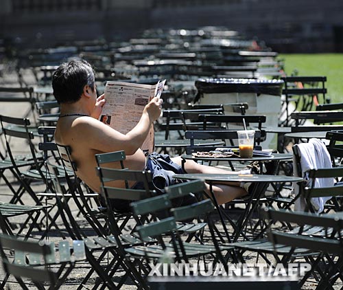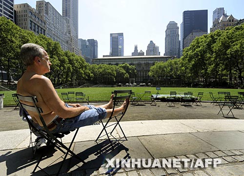 6月9日,在美國(guó)紐約布賴(lài)恩特公園,一名男子赤裸上身坐在曬得滾燙的椅子上。新華社/法新