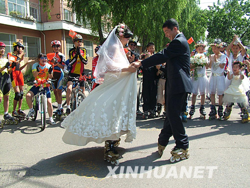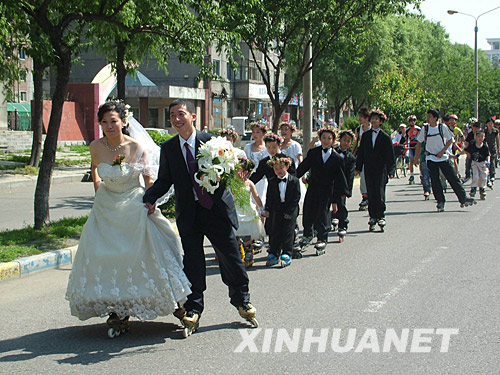 6月15日,黑龍江省牡丹江市的逯璐與哈爾濱姑娘王詩洋喜結(jié)良緣,倆人和親朋好友們穿著輪滑鞋,一起在街頭滑行。