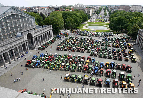 6月18日,比利時農(nóng)民將拖拉機停放在首都布魯塞爾市中心進行抗議。新華社/路透