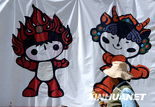 6月17日,一名藏族老阿媽從一個(gè)印有福娃的橫幅前走過。北京奧運(yùn)圣火將于6月21日在西藏自治區(qū)首府拉薩傳遞。