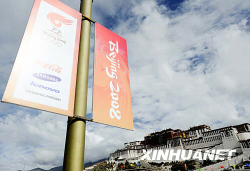 這是6月17日拍攝的懸掛在布達(dá)拉宮廣場(chǎng)前的奧運(yùn)圣火傳遞的宣傳板。北京奧運(yùn)圣火將于6月21日在西藏自治區(qū)首府拉薩傳遞。