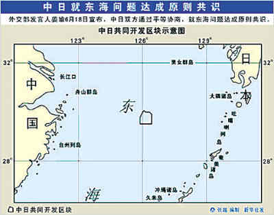 外交部發(fā)言人姜瑜18日宣布,中日雙方通過平等協(xié)商,就東海問題達成原則共識。 一、關(guān)于中日在東海的合作 為使中日之間尚未劃界的東海成為和平、合作、友好之海,中日雙方根據(jù)2007年4月中日兩國領(lǐng)導(dǎo)人達成的共識以及2007年12月中日兩國領(lǐng)導(dǎo)人達成的新共識,經(jīng)過認真磋商,一致同意在實現(xiàn)劃界前的過渡期間,在不損害雙方法律立場的情況下進行合作。為此,雙方邁出了第一步,今后將繼續(xù)進行磋商。 二、中日關(guān)于東海共同開發(fā)的諒解 作為中日在東海共同開發(fā)的第一步,雙方將推進以下步驟: 。ㄒ唬┯梢韵赂髯鴺(biāo)點順序連線圍成的區(qū)域為雙方共同開發(fā)區(qū)塊(見上圖): 北緯29°31′,東經(jīng)125°53′30″;北緯29°49′,東經(jīng)125°53′30″;北緯30°04′,東經(jīng)126°03′45″;北緯30°00′,東經(jīng)126°10′23″;北緯30°00′,東經(jīng)126°20′00″;北緯29°55′,東經(jīng)126°26′00″;北緯29°31′,東經(jīng)126°26′00″ 。ǘ╇p方經(jīng)過聯(lián)合勘探,本著互惠原則,在上述區(qū)塊中選擇雙方一致同意的地點進行共同開發(fā)。具體事宜雙方通過協(xié)商確定。(三)雙方將努力為實施上述開發(fā)履行各自的國內(nèi)手續(xù),盡快達成必要的雙邊協(xié)議。(四)雙方同意,為盡早實現(xiàn)在東海其它海域的共同開發(fā)繼續(xù)磋商。 三、關(guān)于日本法人依照中國法律參加春曉油氣田開發(fā)的諒解 中國企業(yè)歡迎日本法人按照中國對外合作開采海洋石油資源的有關(guān)法律,參加對春曉現(xiàn)有油氣田的開發(fā)。 中日兩國政府對此予以確認,并努力就進行必要的換文達成一致,盡早締結(jié)。雙方為此履行必要的國內(nèi)手續(xù)。 |