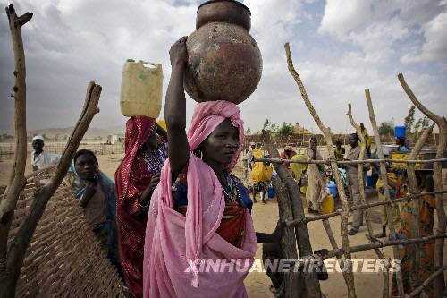 6月19日,在乍得東部的一個難民營,來自達爾富爾地區(qū)的幾名難民頂著罐子前往井中取水。 新華社/路透