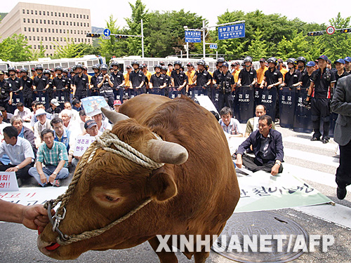 | 6月26日,在韓國釜山,防暴警察與抗議政府恢復(fù)進(jìn)口美國牛肉的民眾對峙。