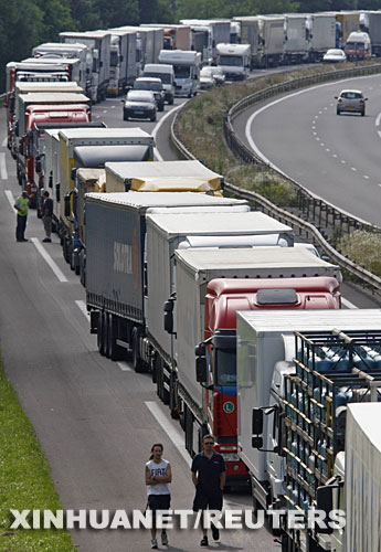 6月30日,在法國(guó)斯特拉斯堡附近,一條公路被卡車堵塞。