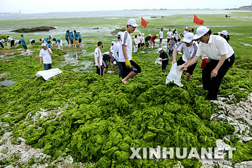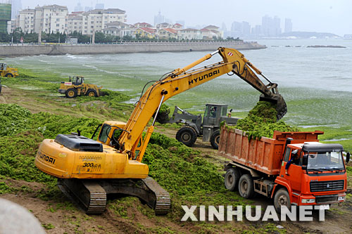 6月上旬以來,青島市近海海域開始出現(xiàn)大面積滸苔,最大影響面積達(dá)到1.3萬平方公里,實(shí)際滸苔覆蓋面積約為400平方公里,對(duì)城市景觀和奧帆賽運(yùn)動(dòng)員賽前訓(xùn)練產(chǎn)生了一定的影響。面對(duì)突如其來的自然災(zāi)害,青島全市上下積極行動(dòng),社會(huì)各界群眾從海上、潮間帶、岸邊進(jìn)行全方位的打撈清理。目前,每天已有超過萬人、千余艘各類船只、數(shù)十臺(tái)裝運(yùn)機(jī)械投入到清理行動(dòng)中。截至6月28日,清理滸苔數(shù)量超過10萬多噸。